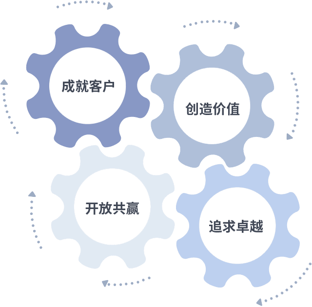 成就客户是一切决策的出发点,,,创造价值是衡量所有工作的标准,,,追求卓越是我们做事做人的态度,,,,开放共赢是我们的格局也是最终的结果。。价值观的齿轮环环相扣,,推动着组织里的每个人不断向前。。