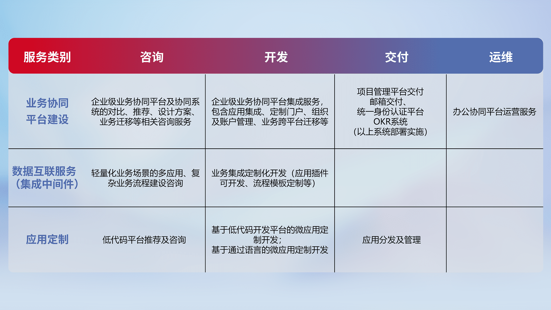 针对钉钉、、、企微、、、IDaas等平台级产品提供产品的规划、、、方案、、交付、、定制化开发等服务,,实现如统一协同办公、、智能客户服务、、混合会议管理、、、、智能数据查询、、等业务场景,,,实现数字化转型。。